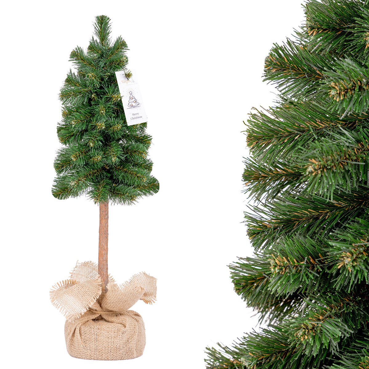 Der nächste Vorschlag wird bestimmt sehr den Klassik Liebhabern gefallen. Ein künstlicher Weihnachtsbaum mit einem Baumstamm ist eine Verbindung von Tradition und Innovation. Der künstliche Nadelbaum wurde auf einem natürlichen Baumstamm mit einem Ständer angebracht, der in einem ökologischen Jutesack stilistisch eingepackt wurde.